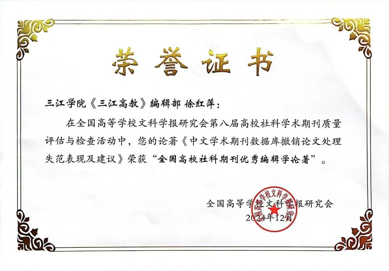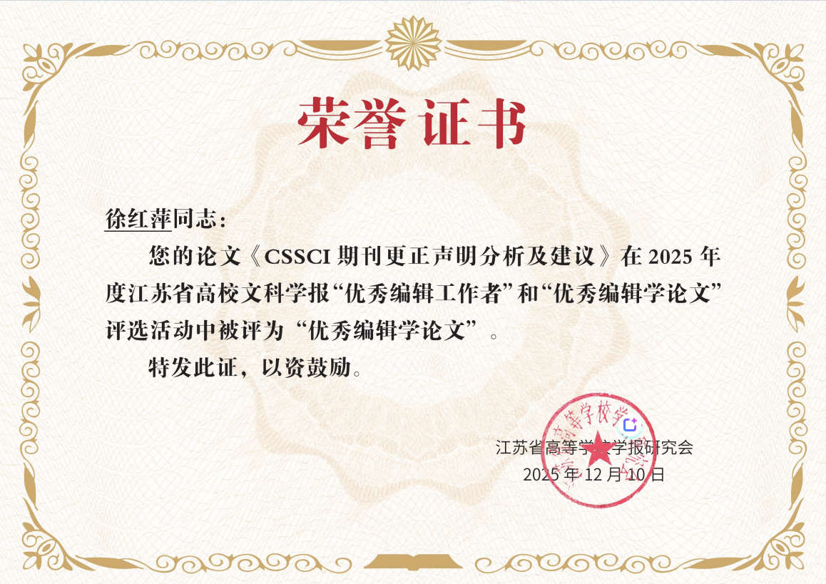 19.在2025年度江苏高校文科学报“优秀编辑学论文”评选活动中,《三江高教》编辑部徐红萍副编审的论文《CSSCI期刊更正声明分析及建议》被评为江苏高校文科学报“优秀编辑学论文”。