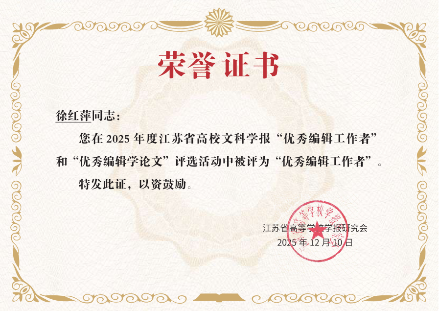 徐红萍副编审的论文被评为2025年度江苏高校文科学报 “优秀编辑学论文”